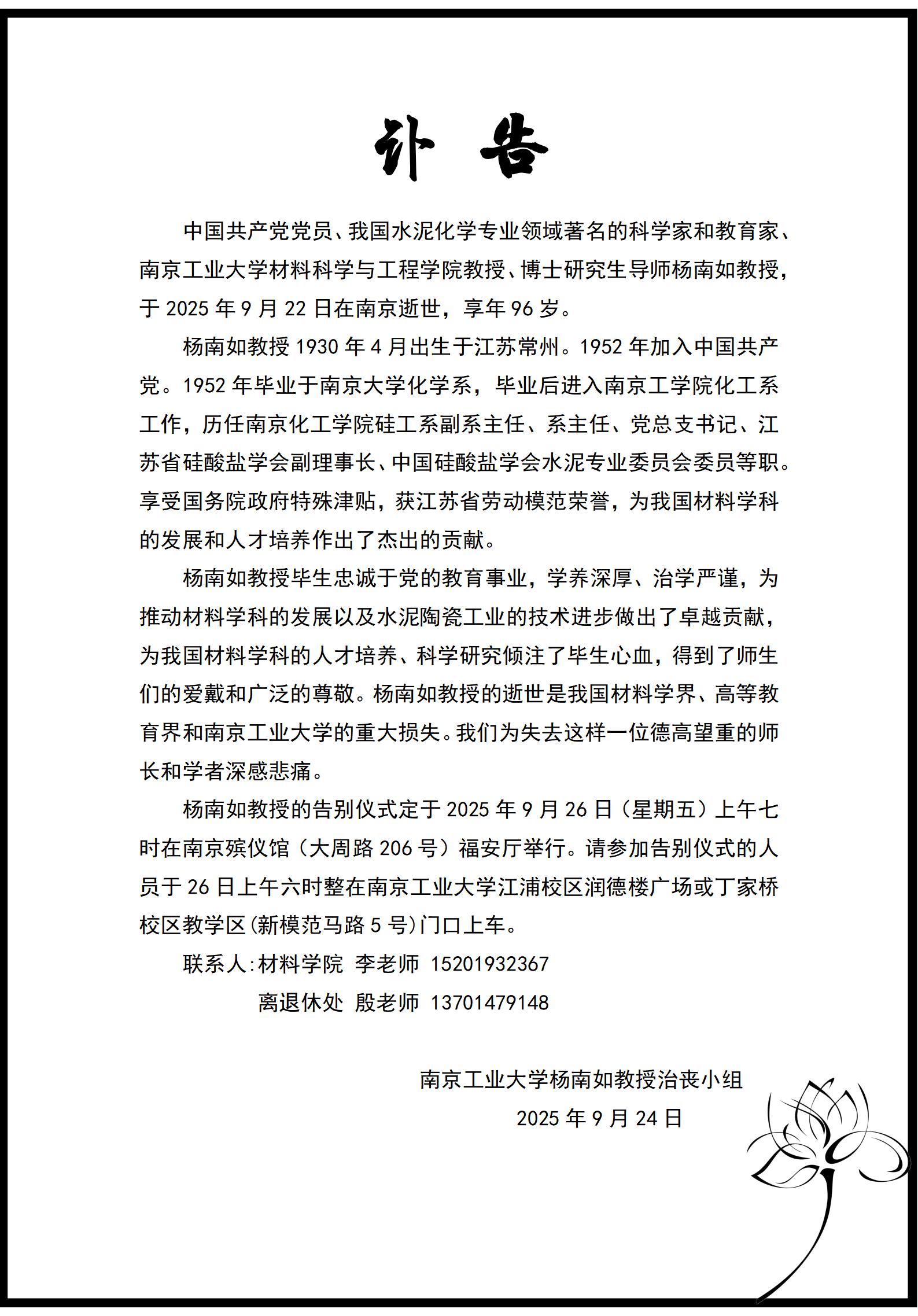 杨南如教授,我国水泥化学专业领域著名的科学家和教育家,1930年4月出生于江苏常州,1952年加入中国共产党。1952年自南京大学化学系毕业后进入南京工公司化工系工作,历任南京化工公司硅工系副系主任、系主任、党总支书记,兼任江苏省硅酸盐学会副理事长、中国硅酸盐学会水泥专业委员会委员等职。2025年9月22日在南京逝世,享年96岁。