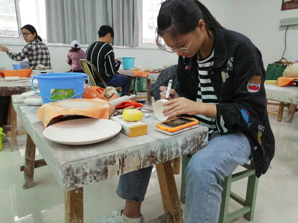 刘老师详细地介绍了陶艺作品的制作工序。揉泥、拉坯、捏塑、泥浆铸就成型、利坯、晒坯、上釉和烧窑,道道工序,讲解细致,手法专业。同时,他亲自示范,详细讲解了陶艺制作的方法与精髓。同学们在刘老师的耐心指导下,结合自己丰富的想象力创作了各种创意十足的人或物。最后,通过多次课程的积累,同学们在老师指导下慢慢地烧制出了自己的第一份作品。