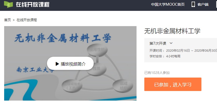 《无机非金属材料工学》课程教学团队于2016年承担了省在线课程项目,在中国大学MOOC(爱课程)平台建设了完整的课件、视频、测验、作业等在线教学资源,并已在多个学年的教学中采用了该网课资源。目前已经有包括社会学习者在内的1028人选课。
