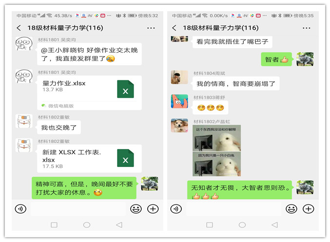 抽象的理论课程量子力学与物质结构也火速上线,为将平时面对面授课都十分“烧脑”的繁杂公式和逻辑推理在线上讲清楚,公司王晓钧教授从员工角度出发,制作课程前先对员工情况作了摸底,将终端普及化和智能化的微信作为教学平台,可以在线视频,可以私聊,可以下载教学文件,可以提交作业,可以友好互动,可以活跃气氛,对无Wifi不能上线学习的员工,提前发送学习资料。