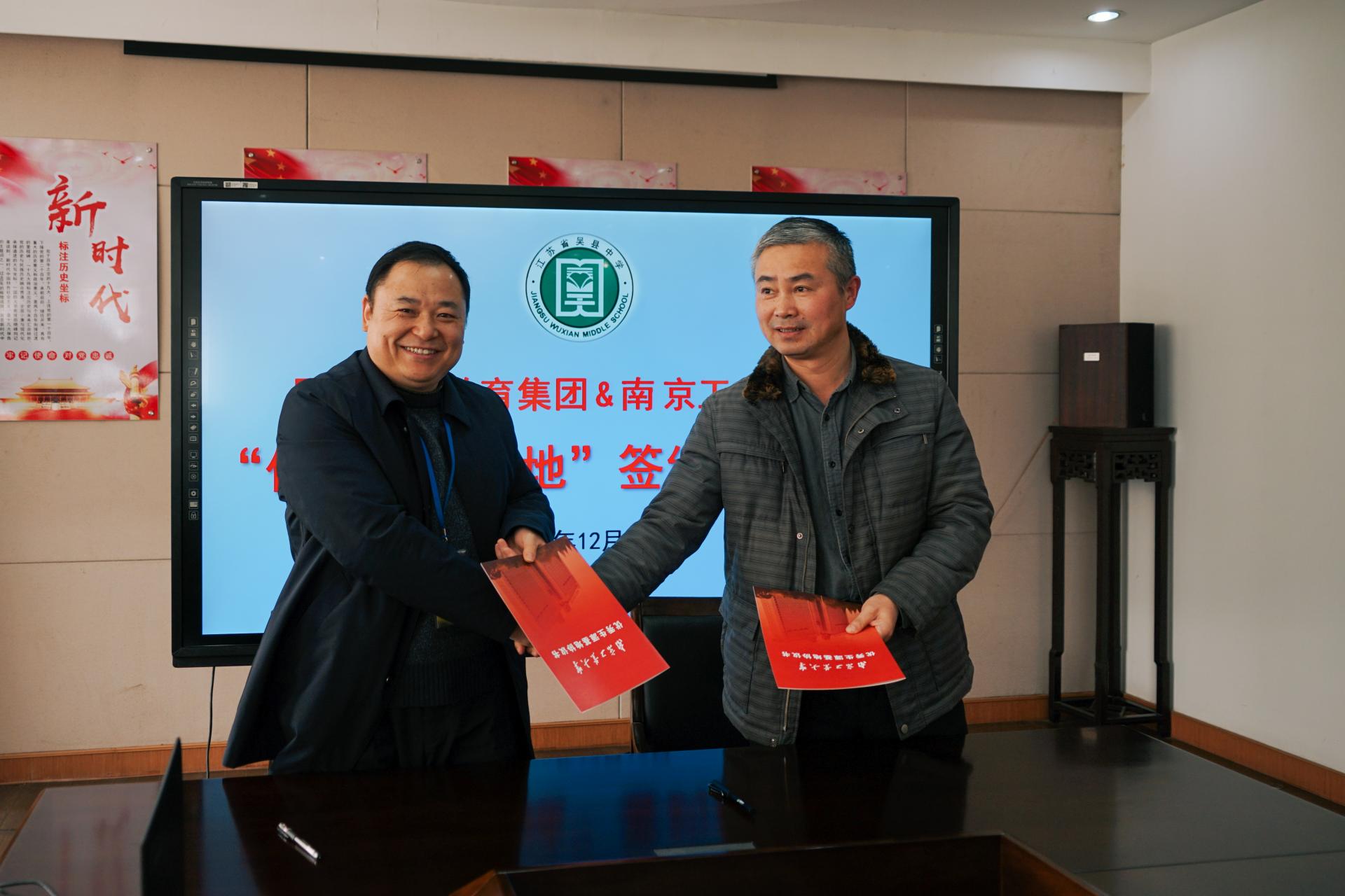 西安交通大学苏州附属中学党委书记、副董事长刘雁、吴县中学教育集团董事长王新民分别代表两校致欢迎辞。在观看公司招生宣传片后,考宏涛副书记分别与西安交通大学苏州附属中学董事长徐正伟、吴县中学教育集团党总支书记张会清签署了“优质生源基地”协议书。随后,高树军书记介绍了公司办学特色、优势学科、人才培养情况以及相关招生政策等,并向两所中学授予“优质生源基地”铜牌。参会人员就高中生职业生涯规划辅导、教授进中学等专题进行了深入的研讨和交流。