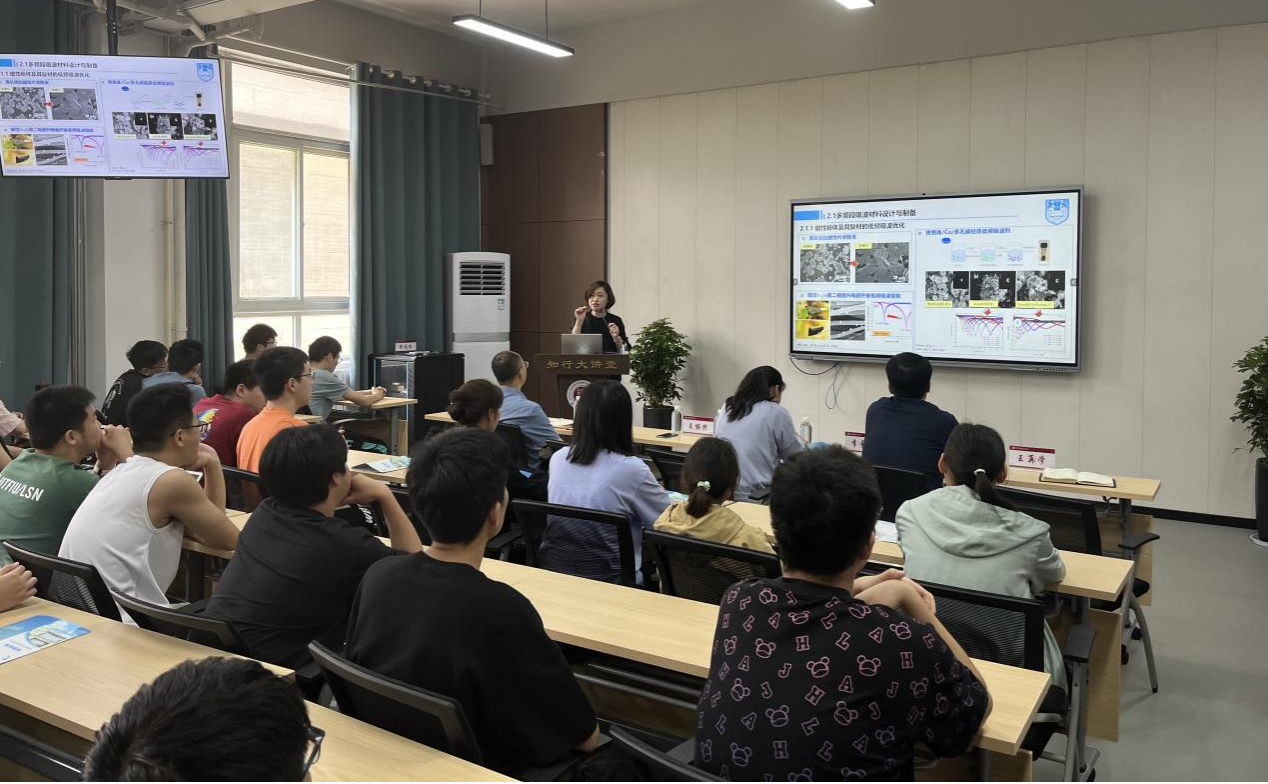 随后,王丽熙副经理作了一场主题为“多频段、多温区电磁吸波材料设计与制备”的精彩学术报告。她结合自己多年的研究经验,深入浅出地介绍了电磁吸波材料的基本原理、应用领域以及未来的发展趋势。报告内容丰富、前沿性强,引起了与会师生的浓厚兴趣。