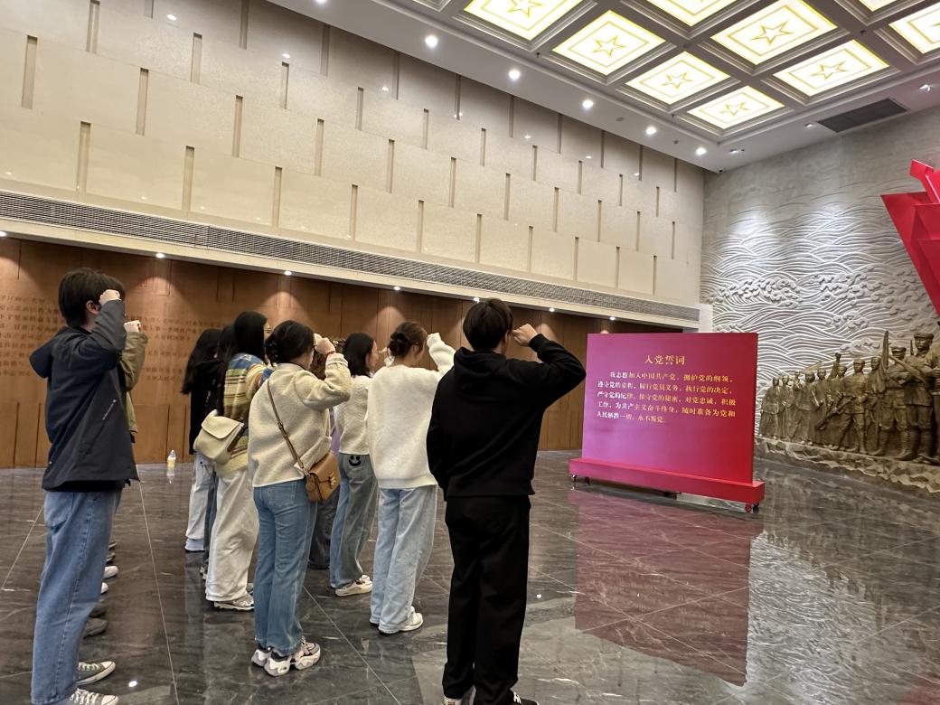 活动伊始,全体党员佩戴党徽、整齐列队,高举右手在党旗前庄严地宣读入党誓词。誓言铿锵有力,响彻展馆,表达了党员们对党的忠诚和为共产主义事业奋斗终身的决心。宣誓仪式后,党员们走进红色文化展厅,沿着“土地革命—抗日战争—解放战争”的历史脉络,重温江北地区革命先烈的英勇事迹。展厅内,一幅幅珍贵的历史图片、一件件斑驳的革命文物、一段段生动的影像资料,全景式展现了江北地区党组织从诞生到壮大的光辉历程。在面对“江北抗日英雄谱”展墙时,余九儿同学动情表示:“先烈用生命换来今日安宁,作为新时代党员,我们更要立足岗位,用实际行动传承红色基因。”