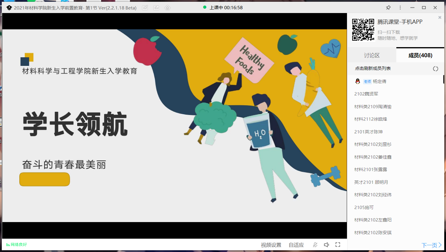 为引导2021级新生尽快适应大学学习和生活环境,增强同学们的集体荣誉感和归属感,营造积极进取,严谨求实的优良学风。2021年9月9日,新生辅导员金蓓蓓、优秀员工代表为2021级400余名新生开展了入学教育第一讲,课程在线上腾讯课堂平台进行。