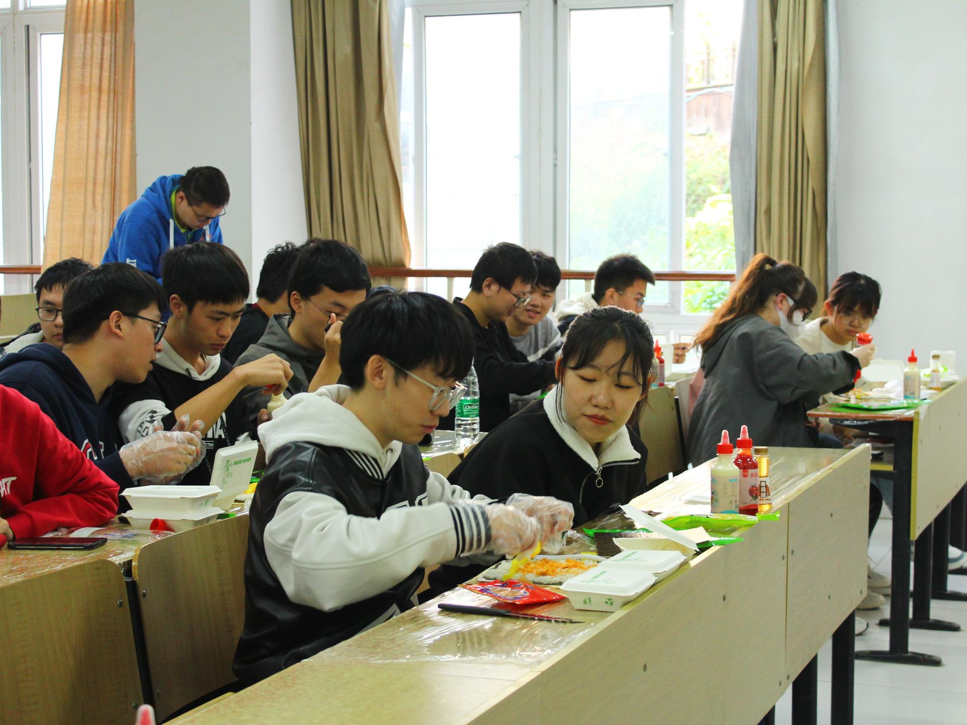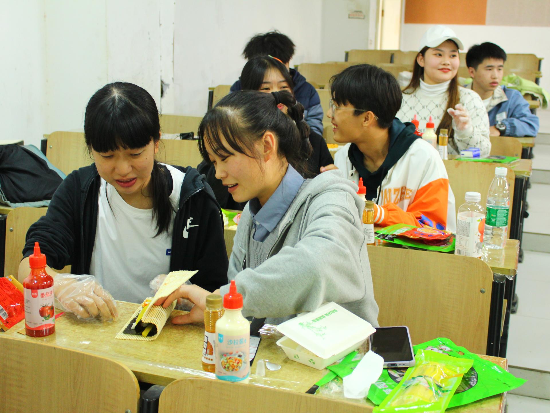活动伊始,主持人姜昊向同学们介绍了美食有可以治愈心灵、化解悲伤和愉悦心情的效果,让同学们对食物与心理之间的关系有了新的了解。随后,参赛选手自由组队共同制作寿司。根据活动规则,分享故事的同学们也相应能够获得更多的食材以制作寿司,同学们踊跃上台,纷纷分享自己印象深刻的或励志或暖心故事。活动现场气氛热烈,充满欢声笑语。大一新生刘欣怡表示,整场活动下来自己感觉很放松,很快乐,以后还想再来参加一次。