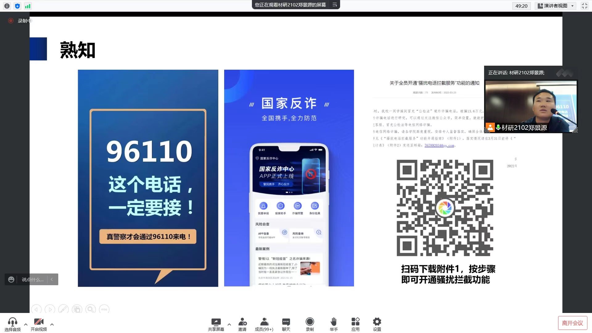为迎接首届校研究生宿舍文化月的到来,提高同学们的防诈骗意识,5月11日下午,best365足球官网邀请best365足球官网党委保卫部、保卫处葛凯老师为全院研究生带来了一场防诈骗知识专题讲座,分管院领导及辅导员参加了本次讲座,讲座采用线上线下相结合的方式开展。