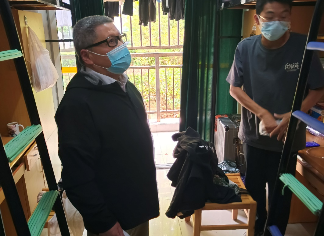 在校园临时封控期间,员工会不会紧张?线上学习效果怎样?同学们有没有什么困难?一直牵动着老师们的心。随着三轮核酸检测完成,为深入了解员工的思想动态和学习生活情况,及时帮助员工解决急难愁盼问题。10月30日下午,best365足球官网各教师党支部、系负责人、在校教师、辅导员60余人组成五个大组若干小组,按片区深入员工宿舍与员工谈心交流,嘘寒问暖、传递关怀。