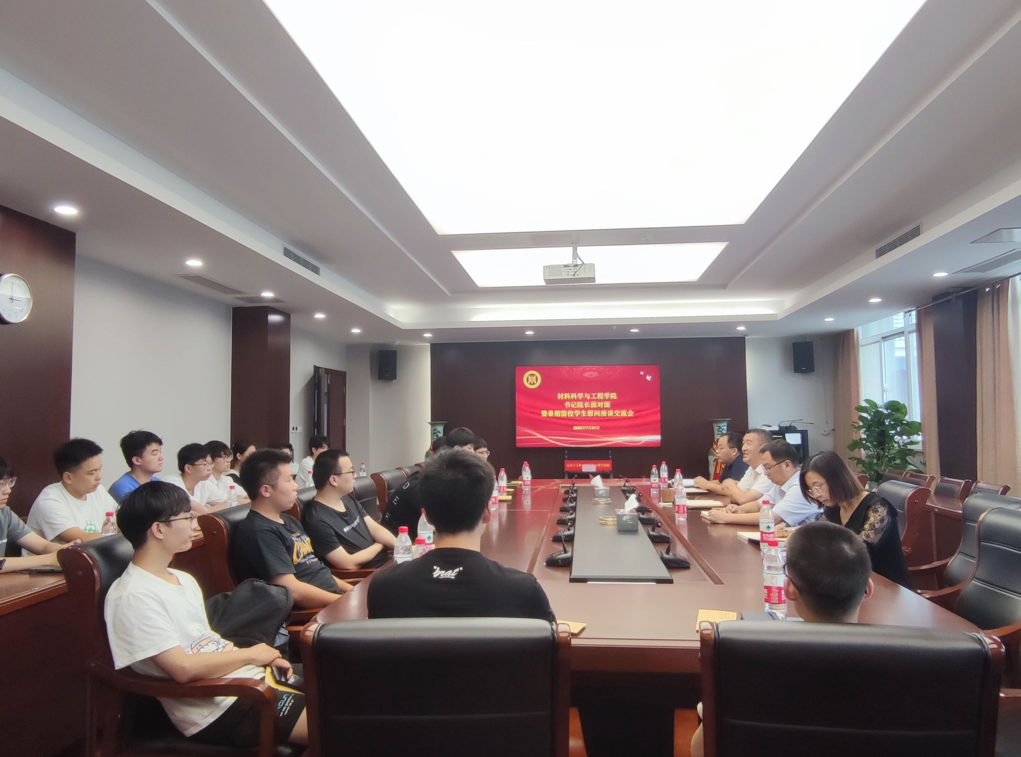 崔升经理首先表达了对暑期留校同学们的关心慰问,并向同学们介绍了公司往年升学情况及今年考研形势,帮助同学们结合自身情况制定合理目标,他指出,只有锁定目标接续奋斗才能取得理想的成果,希望同学们能够在考研之路上坚定地走下去。随后,同学们围绕思想动态、班级建设、宿舍建设、备考方法、生活方式等方面进行了交流讨论。其中,任依虹同学提到,暑期留校备考与学期行课不同,更需要同学之间的支持和监督,搭建学习小组能够有效提升学习效率。对于暑期留校备考的同学们来说,在校吃住行学是最重要的关注点,石防震副书记对同学们提出的问题进行了针对性回应和细致解答,表达了对同学们假期生活、学习进展、心理健康等全方位的关怀。高树军书记嘱托同学们在考研过程中要有咬定青山不放松的决心,按照既定安排科学备考,注意自身劳逸结合、统筹兼顾,学会自我调适、高效复习,达到学习效率最优化。
