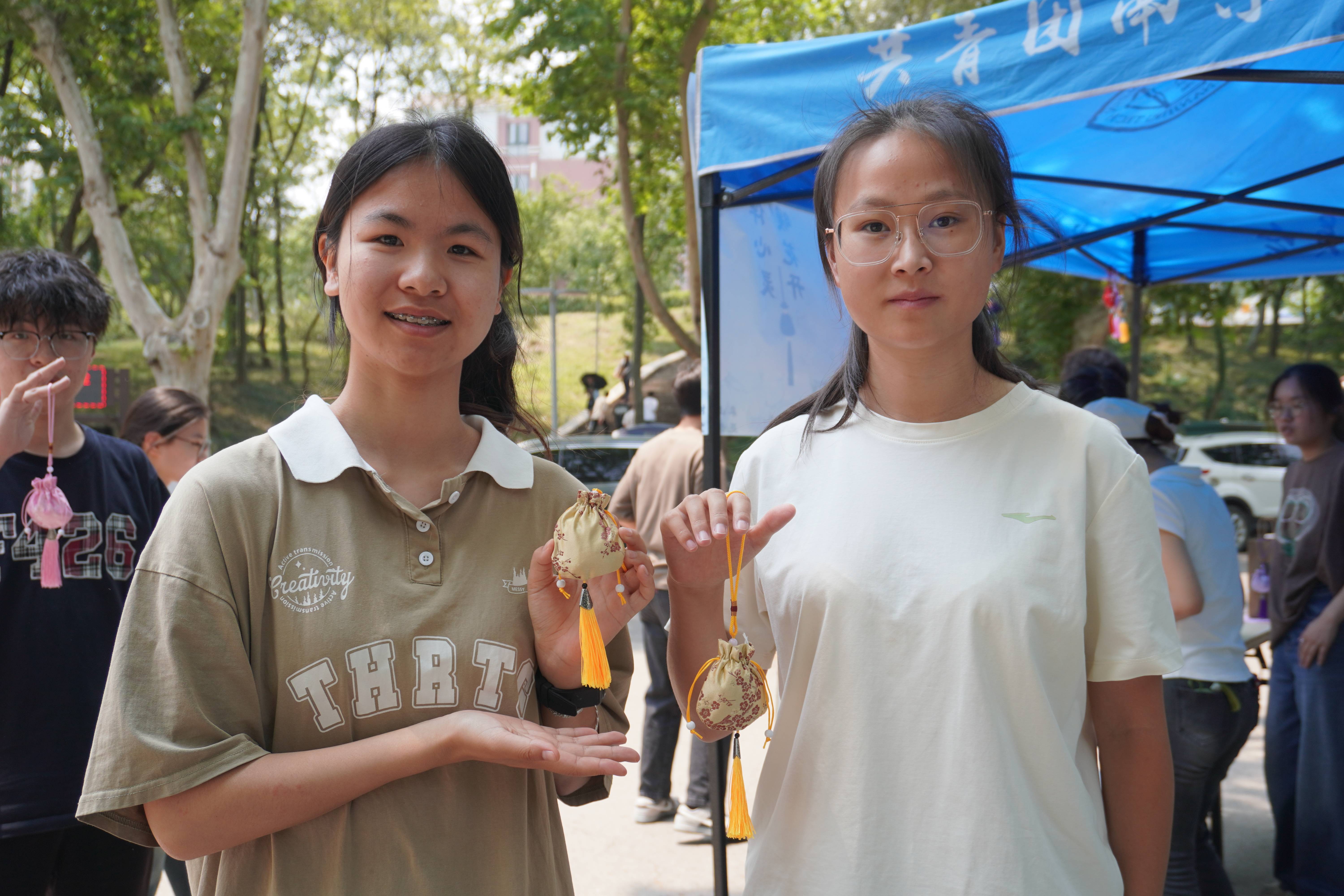 活动现场,色彩斑斓的香囊错落有致地铺展在长桌上,与空气中弥漫的艾草、薰衣草芬芳交织成一幅动人的画面。同学们围聚一堂,手持木夹,细心地将香料填充进香囊内衬,随着一个个造型精致、香气四溢的香囊逐渐成型,现场气氛热烈,欢声笑语不断。