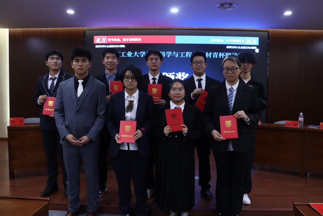 进入决赛的复材2501班、高材2501班联队与材料2501班、金属2502班联队围绕“当今社会通才与专才何者更具竞争力”这一辩题展开激烈交锋。辩论过程中,双方辩手思路清晰、引证丰富、驳辩有力,充分展现了材料学子扎实的学识素养、敏捷的思辨能力与当代青年对社会现实的深入关注。评委从立论深度、论证逻辑、语言表达及团队配合等多维度给于了综合评审,最终复材2501、高材2501联队夺得本届辩论赛冠军,江妍同学凭借出色表现荣获“最佳辩手”称号。