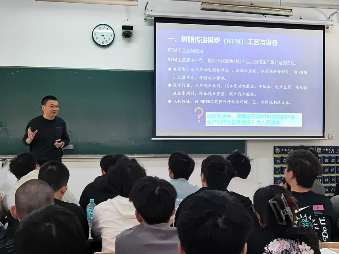 4月14日,中材科技风电叶片股份有限公司高级工程师王刚产业教授以“RTM与真空导入工艺的产业化应用”为主题,通过军民两用典型产品案例导入课程,重点解析了风电叶片智能制造全流程。从原材料设计、工艺优化到质量检测,他结合企业实践经验,阐述了复合材料在新能源领域的核心优势,强调了“智能化、低碳化是未来工艺升级的必由之路。”