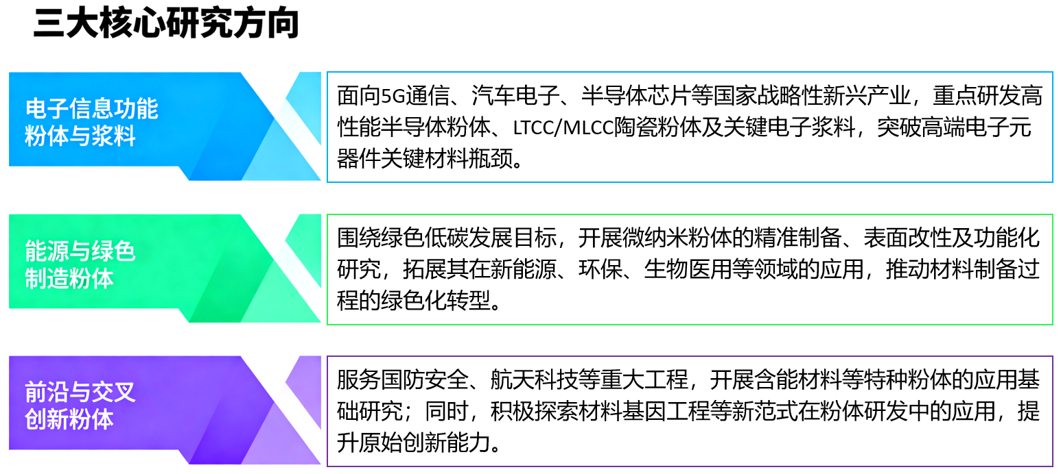 研究所紧密围绕国家战略顶层设计,聚焦国家重大需求,布局三大核心研究方向:电子信息功能粉体与浆料、能源与绿色制造粉体及前沿与交叉创新粉体。
