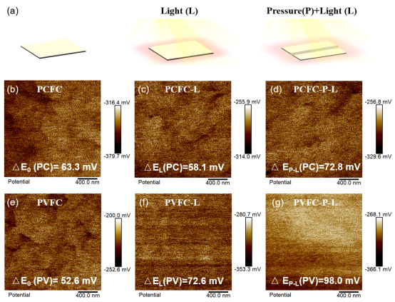 图6. (a) PVFC和PCFC薄膜样品进行KPFM测试时的条件示意图。(b) PCFC (c) PCFC-L (d) PCFC-P-L (e) PVFC (f) PVFC-L (g) PVFC-P-L。