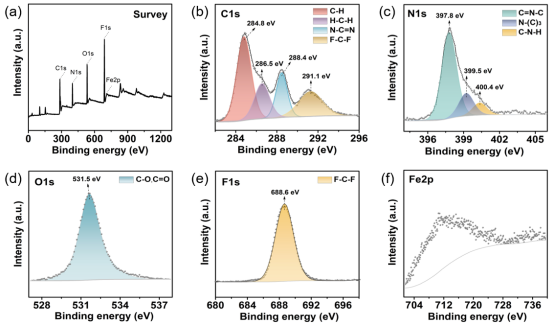图2. PVFC螺旋微马达的XPS光谱。(a) XPS测试总谱; (b) C1s, (C) N1s, (d) O1s, (e) F1s, (F) Fe2p 的核级谱图。