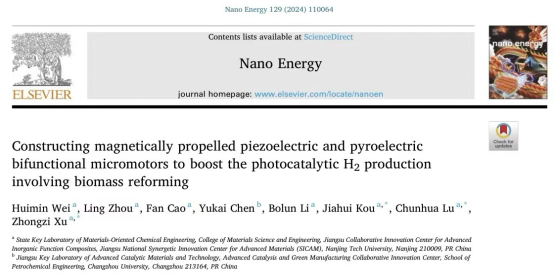 相关成果以“Constructing magnetically propelled piezoelectric and pyroelectric bifunctional micromotors to boost the photocatalytic H2 production involving biomass reforming”为题,发表在《Nano Energy》(论文期刊号:Nano Energy 129 (2024) 110064 IF=16.8)上。