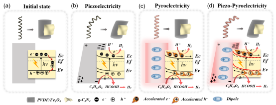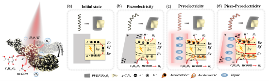 图8. 磁驱动及全光谱太阳能条件下压电-热释电内建电场耦合光催化生物质制氢原理图。
