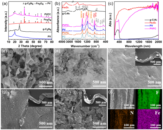图1. (a)样品的XRD图谱,(b)红外光谱,(c)紫外-可见-近红外光谱; (d)热氧化蚀刻后g-C3N4的FE-SEM图像和(e)TEM图像; (f) PV, (g) PVDF/Fe3O4, (h) PVFC样品的FE-SEM图像。插入图像为LR-FESEM图像; (i) PVFC的EDS元素映射图像。