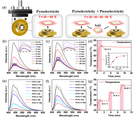 图4. (a)高温荧光附件图及压电-热释电耦合荧光测试方法。(b) PVFC和 (c) PCFC在不同测试时间的荧光图。(d)热释电测试时的附件温升图。(e) PVFC和 (f) PCFC在折叠和温升下的荧光图。(g)压电-热释电耦合测试时的附件温升。(λex= 380 nm)。