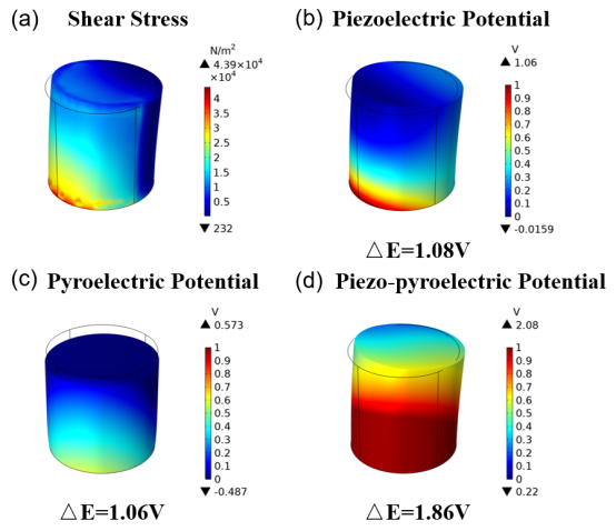 图7. PVFC样品的COMSOL模拟。(a)剪切应力分布,(b)压电电势分布,(c)热释电电势分布,(d)压电和热释电协同电势分布。