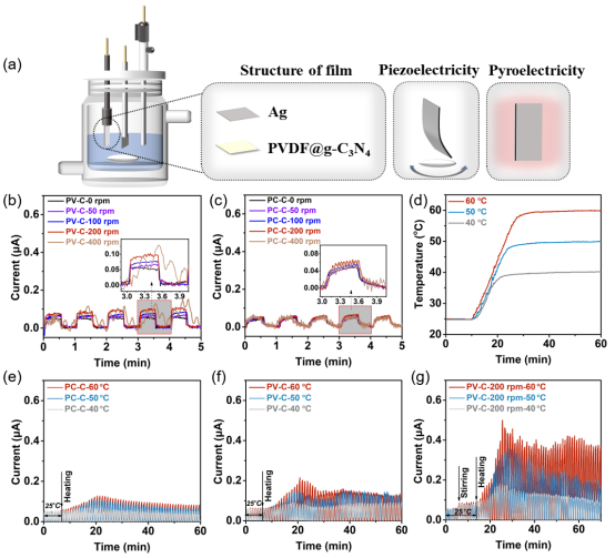图5. (a)光电流测试方法示意图。(b)不同搅拌速度下PV基薄膜的光电流。(c)不同搅拌速度下PC基薄膜的光电流。(d)电解液温升曲线。(e)不同温升条件下PC基薄膜的光电流。(f)不同温升条件下PV基薄膜的光电流。(g)搅拌和升温协同作用下PV基薄膜的光电流。
