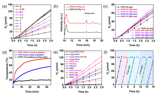 图3. (a)葡萄糖浓度为0.05 ~ 5 g/10 mL时,PVFC螺旋微马达光催化制氢量。(b) PVFC螺旋微马达在氙灯照射和搅拌条件下光催化反应1 h和3 h时的甲酸含量。(c)不同转速条件下样品的压电光催化制氢量。(d)样品在不同光催化反应条件下的温升图。(e)有或没有氙灯照射、磁力搅拌和葡萄糖存在的样品光催化制氢量。(f)氙灯照射和磁搅拌条件下PVFC螺旋微马达光催化循环产氢。