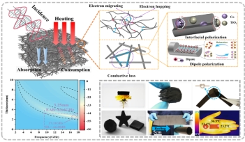 该论文中采用简单可控的混合溶液静电纺丝结合高温热处理工艺成功制备了Co和TiO2修饰的SiOC复合(CTS)纳米纤维。由于静电纺丝提供的优异的三维连续网络结构和复合相在纤维内的均匀分布,CTS复合纳米纤维表现出出色的隔热性(导热系数小于0.0404 Wm-1K-1)、优异的柔韧性(经过1500次的180°弯曲循环后电阻变化小于4%)和压缩回弹性(在应变为60%条件下经过500次压缩循环后残余应变小于12%)。在2~18 GHz波段内,纤维吸波相含量仅为5wt%的CTS-800样品可实现8.64GHz(9.36~18.00GHz)的有效吸收带宽以及-66.00dB的最低反射率(RLmin)。这种多功能CTS纳米纤维材料的成功制备,为热&电磁兼容防护材料的开发提供了广阔的前景。