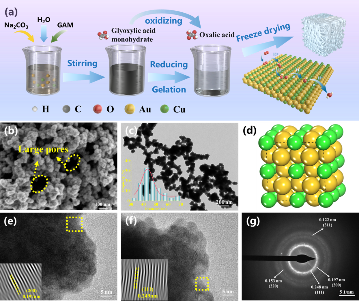 对此,公司崔升教授、吴晓栋副教授课题组基于高通量计算ORR火山图的指导,采用Au作为催化主体,并根据Sabatier原理引入Cu优化中间体吸附能。这种方法旨在实现既不太强也不太弱的最佳结合强度,在提高活性的基础上降低成本。通过金属粒子自组装和冷冻干燥技术相结合制备的一种新型Au2Cu合金气凝胶电催化剂,具有分级的"珍珠链状"气凝胶结构,高孔隙率和用于物质扩散的大比表面积。此外,Au2Cu合金气凝胶电催化剂在0.1 M KOH电解液中表现出较高的半波电位(0.85 V vs . RHE)和动力学电流密度(5.3 mA·cm-2)。此外,经5000次循环耐久性测试后,与商业Pt/C相比,Au2Cu合金气凝胶催化剂表现出优异的ORR稳定性、甲醇以及硫氰酸根离子耐受性。同时,组装的Au2Cu合金气凝胶基ZABs具有1.48 V的开路电压,211 mW·cm-2的大功率密度,并且在5 mA·cm-2的电流密度下进行160 h的充放电测试后仍保持优异的循环稳定性,表明其在ZABs和燃料电池领域具有优异的潜在应用价值。根据d带中心理论,部分氧化的Au2Cu合金气凝胶促进了能带中心远离费米能级,吸附物的反键能级降低,占据了更多的电子,从而降低了*OOH中间体的结合强度,这是ORR活性增强的原因。这项研究揭示了Au2Cu合金气凝胶催化剂在ORR中的反应机制,为开发低成本、高效、稳定的贵金属基电催化剂提供了新的思路。