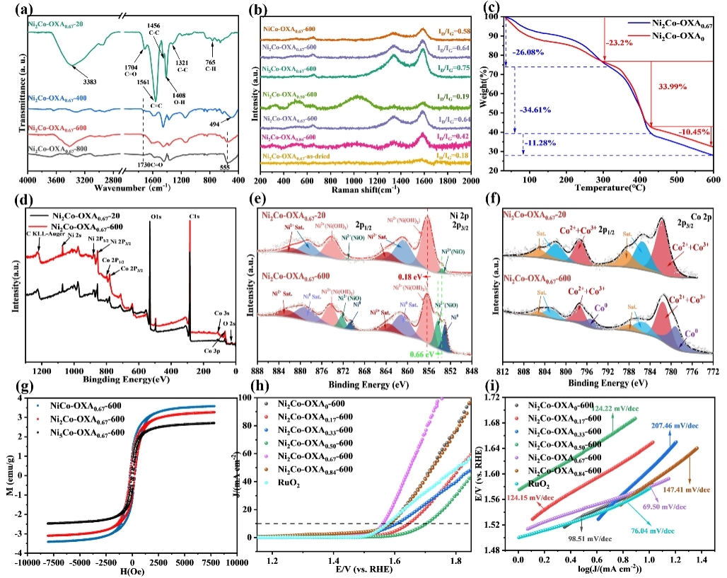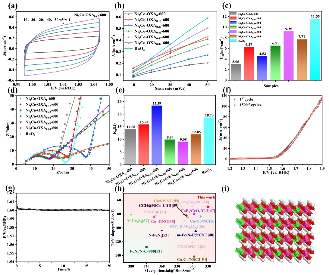 对此,团队聚焦过渡金属气凝胶电催化剂,通过简单的溶胶-凝胶法,创新性结合高温碳还原技术,构建出NiCo双金属气凝胶电催化剂。高温碳还原过程中,邻苯二甲酸中的苯环在惰性气氛下裂解成具有还原性的单质碳,把金属氧化物气凝胶还原成合金气凝胶。该气凝胶电催化剂具有较大的比表面积和丰富的传质通道。催化剂在10 mA·cm-2的电流密度下过电位为330 mV,并且塔菲尔斜率低至69.5 mV·dec-¹,与碱性条件下的商用RuO₂相比,具有更高的OER活性。催化剂在催化过程中实现表面重构,由金属气凝胶原位的转变为层状氢氧化物(LDH)结构,防止了金属粒子的溶出,使催化剂实现了长期的稳定性。催化剂进行1500个周期的CV循环后,LSV曲线几乎没有发生偏移,性能并未发生明显衰减,长期稳定性良好。值得注意的是,整个体系没有贵金属的引入,廉价的非贵金属使得最终的催化剂具有低成本特性。并且,密度泛函理论(DFT)计算表明理论与实验相互佐证,金属气凝胶在催化电化学反应时原位生成了羟基氧化物,而羟基氧化物又优化了*OOH的吸附能。该研究设计为低成本、高效率、高稳定性的氧催化剂的合成开辟了一条实用性良好的新途径。