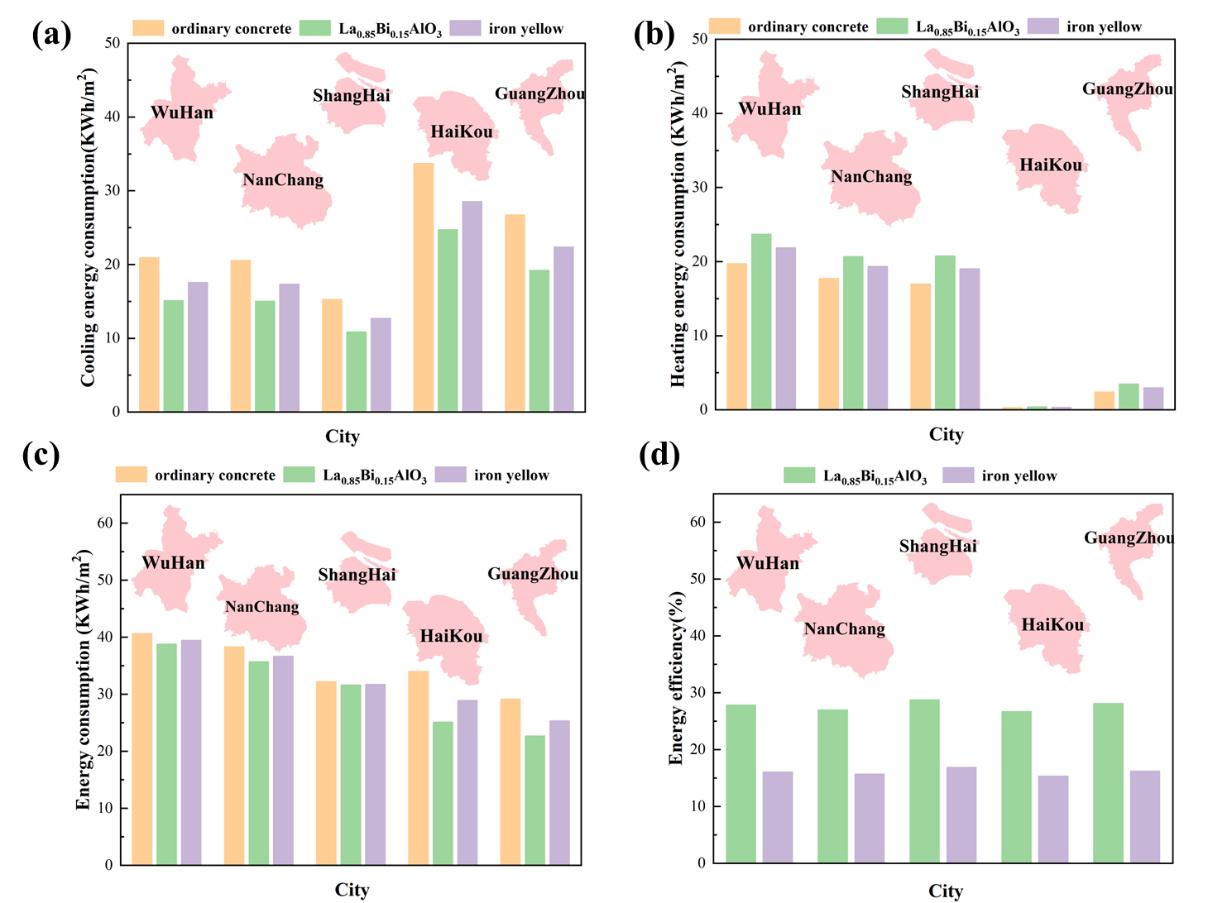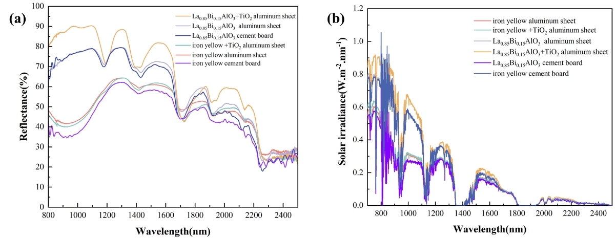 针对这一难点,best365足球官网公司崔升教授、张垠教授课题组以LaAlO3钙钛矿为基体,引入Bi3+离子进行掺杂调控,构建了具备调色功能与高NIR反射性能兼容的La1-xBixAlO3黄色冷颜料体系。创新之处在于通过调节Bi3+掺杂比例,实现在可见光区增强吸收、形成明亮黄色的同时,保持近红外区的高反射能力,突破了传统颜料在色彩与热反射性能间的平衡瓶颈。样品经湿法球磨与高温固相法合成后,XRD证实所有样品保持钙钛矿单一相结构,Raman光谱进一步确认Bi–O键的存在,表明掺杂未破坏晶体骨架。在性能方面,该颜料在700–2500 nm波段的近红外反射率最高可达98.95%,并在模拟阳光照射下相比传统铁黄涂层有效降低表面温度4–5°C,具备优异的热屏蔽能力。耐久性测试结果显示,在酸碱溶液浸泡与户外老化条件下,颜料的色差ΔE*均小于4,近红外反射性能几乎不变,表现出极强的环境稳定性。此外,EnergyPlus模拟结果表明,该颜料涂层可使南方典型城市建筑年冷却能耗降低26%–28%。综合考虑其原料来源丰富、合成工艺简便、性能优异、成本可控,该材料具有显著的经济性和可推广性,在绿色建筑、交通涂层及户外节能领域展现出广阔应用前景。