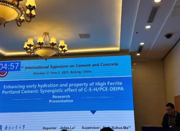 马素花教授积极参与专题研讨,并就低碳水泥设计等议题与各国学者交换意见。博士生李淯伟和褚家浩分别作题为《Coexistence mechanism of C3S and C4A3$ in Alite-Belite-Ye’elimite cement》和《Influence of sodium ions on the synthesis and hydration of belite-ye’elimite-ternesite clinker》的报告。硕士生刘姚、戴航、王训芝和陆金帆分别作了《Preparation of alite-belite-ye'elimite cement clinker by solid waste substitution》《Study on the Performance of Cement–Sodium Silicate Double Slurry Grouted Stone under Different Sea Regions》《Effect of coupling agent on the mechanical properties of polyurethane/water glass composites》《Enhancing early hydration and property of High Ferrite Portland Cement: Synergistic effect of C-S-H/PCE-DEIPA Research》等报告。团队围绕新型低碳胶凝材料的研究引发了国际同行的广泛兴趣与热烈讨论。此次高水平国际学术会议交流,有效提升了公司在水泥与混凝土领域的国际知名度,加强了与国际同行的学术联系,为后续科研工作注入了新动力,充分体现公司在前沿科学研究与国际化人才培养方面的决心与成效。