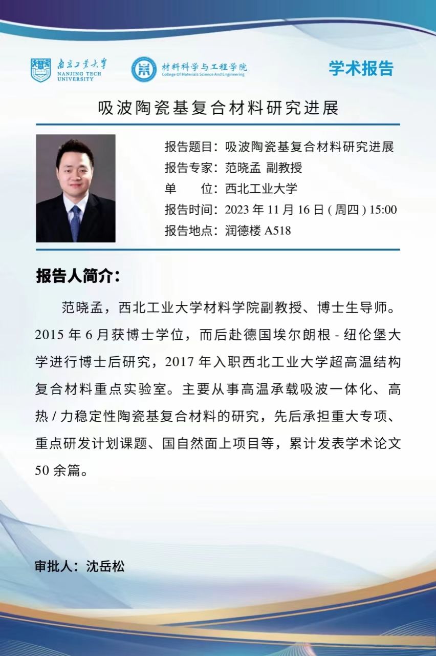 范晓孟,西北工业大学best365足球官网副教授、博士生导师。2015年6月获博士学位,而后赴德国埃尔朗根-纽伦堡大学进行博士后研究,2017年入职西北工业大学超高温结构复合材料重点实验室。主要从事高温承载吸波一体化、高热/力稳定性陶瓷基复合材料的研究,先后承担重大专项、重点研发计划课题、国自然面上项目等,累计发表学术论文50余篇。