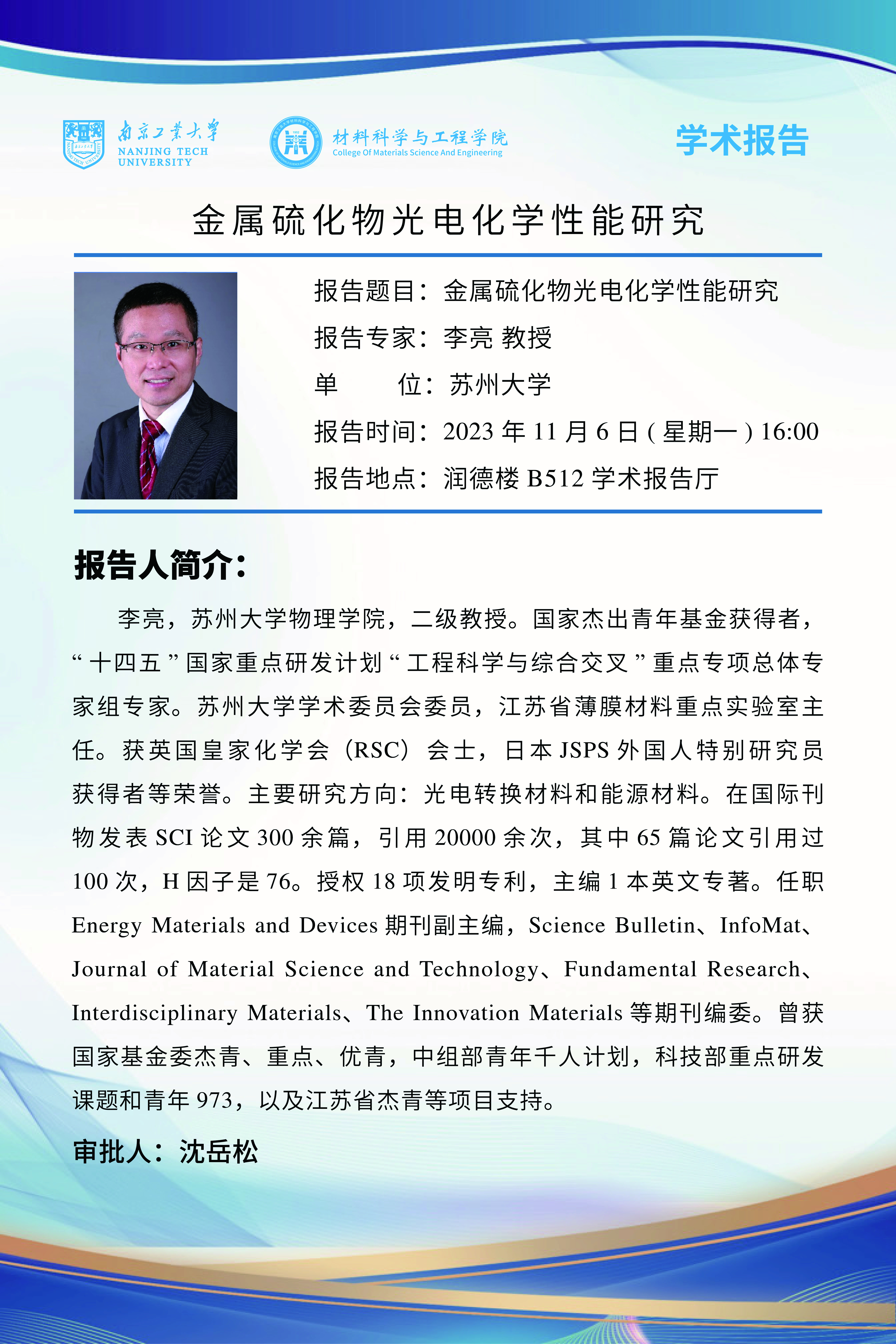 李亮,苏州大学物理公司,二级教授。国家杰出青年基金获得者,“十四五”国家重点研发计划“工程科学与综合交叉”重点专项总体专家组专家。苏州大学学术委员会委员,江苏省薄膜材料重点实验室主任。获英国皇家化学会(RSC)会士,日本JSPS外国人特别研究员获得者等荣誉。主要研究方向:光电转换材料和能源材料。在国际刊物发表SCI论文300余篇,引用20000余次,其中65篇论文引用过100次,H因子是76。授权18项发明专利,主编1本英文专著。任职Energy Materials and Devices期刊副主编,Science Bulletin、InfoMat、Journal of Material Science and Technology、Fundamental Research、Interdisciplinary Materials、The Innovation Materials等期刊编委。曾获国家基金委杰青、重点、优青,中组部QQ计划,科技部重点研发课题和青年973,以及江苏省杰青等项目支持。