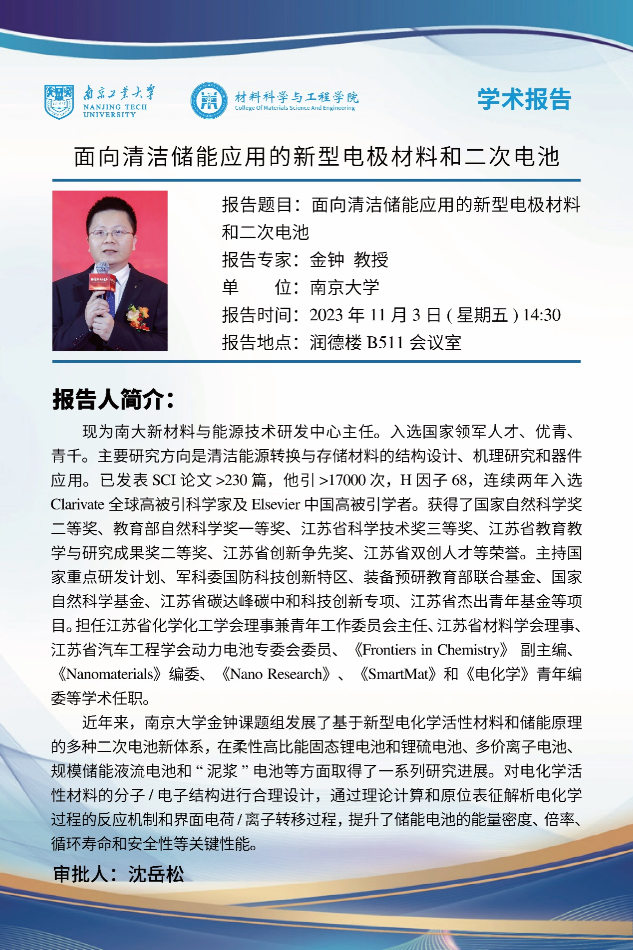 南京大学化学化工公司金钟教授,现为南大新材料与能源技术研发中心主任。入选国家领军人才、优青、青千。主要研究方向是清洁能源转换与存储材料的结构设计、机理研究和器件应用。已发表SCI论文>230篇,他引>17000次,H因子68,连续两年入选Clarivate全球高被引科学家及Elsevier中国高被引学者。获得了国家自然科学奖二等奖、教育部自然科学奖一等奖、江苏省科学技术奖三等奖、江苏省公司产品与研究成果奖二等奖、江苏省创新争先奖、江苏省双创人才等荣誉。主持国家重点研发计划、军科委国防科技创新特区、装备预研教育部联合基金、国家自然科学基金、江苏省碳达峰碳中和科技创新专项、江苏省杰出青年基金等项目。担任江苏省化学化工学会理事兼青年工作委员会主任、江苏省材料学会理事、江苏省汽车工程学会动力电池专委会委员、《Frontiers in Chemistry》副主编、《Nanomaterials》编委、《Nano Research》、《SmartMat》和《电化学》青年编委等学术任职。
