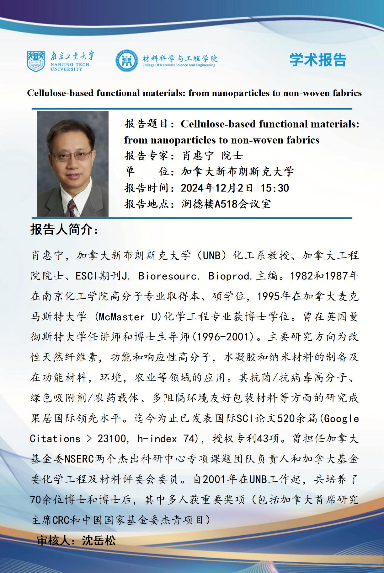 报告题目:Cellulose-based functional materials: from nanoparticles to non-woven fabrics