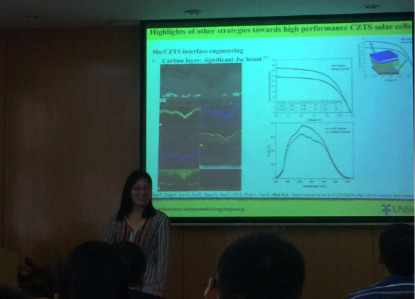 Dr. Xiaojing Hao首先介绍了澳大利亚新南威尔士大学的位置环境、学术氛围及学术影响力,尤其是在太阳能电池研究和商业化方面的世界领先地位;随后详细分析了太阳能电池的发展历程和目前国际上的研究现状,最后重点介绍了她领导的团队在新一代廉价、无毒、柔性Cu2ZnSnS4 (CZTS)太阳能电池领域的开创性工作和取得的一系列重大突破。Dr. Xiaojing Hao的团队目前保持着CZTS太阳能电池光电转化率9.7%的世界纪录,她的报告展示了CZTS太阳能电池良好的发展前景。 此次报告内容丰富、生动精彩,Dr. Xiaojing Hao的讲授和蔼可亲、深入浅出,赢得了在场师生的热烈掌声。报告最后,Dr. Xiaojing Hao就报告内容与在场的师生进行了互动交流,对提出的问题给予了深入的解答,也表达了与公司在科学研究和人才培养、交流方面开展合作的美好愿望。此次报告会拓宽了师生的知识面,使得师生们对新型太阳能电池材料有了更加全面、深入的认识。