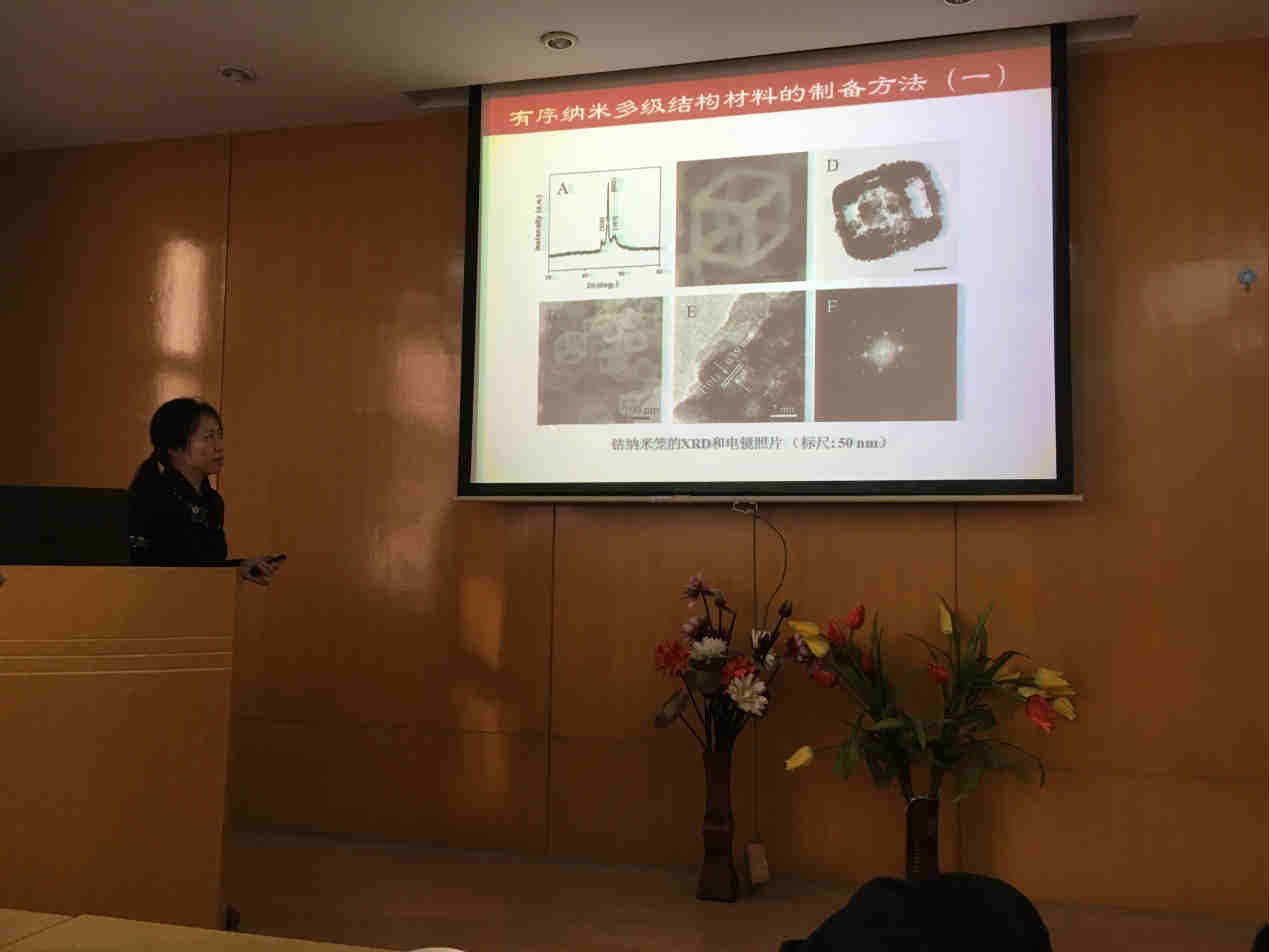 马颖教授的报告从光电功能材料的作用机理、提高光电性能的主要途径等关键的科学问题展开。马教授从单层结构,多层结构,双蛋黄结构等几个方面介绍了目前有序纳米多级结构材料的制备方法和发展历程。此外,马颖教授向师生们展示了自己目前在稀土多级结构材料方面取得的成果。