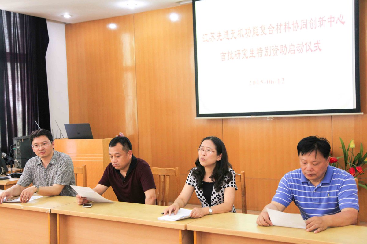 6月12日,江苏先进无机功能复合材料协同创新中心举行了首批研究生特别资助授予仪式。best365足球官网经理沈晓冬教授,研究生院副经理张华教授,best365足球官网副经理王廷尉教授出席。授予仪式由best365足球官网副经理陆春华教授主持。 best365足球官网副经理王庭慰教授宣读《关于确定首批研究生特别资助名单的通知》。根据《江苏无机功能复合材料协同创新中心研究生特别资助管理办法》,经研究生个人申请,专家小组评审,确定胡松、绍高峰、陆依为博士A类资助;杨玮民、黄宝玉、丁玉婕、万维、黄亨明、刘晓霞为博士B类资助;刘泉、王国雨为硕士A类资助;黄惠洪、金诗琪、田露、邹文杰为硕士B类资助。希望受资助的同学能再接再厉,为中心的建设添砖加瓦。 研究生院副经理张华教授在致辞中祝贺获得资助的研究生。希望他们能珍惜获得资助的机会,在今后的学习过程中善于观察问题和勤于思考,取得更多创新成果。 最后best365足球官网沈晓冬经理发表热情洋溢的讲话。沈经理首先肯定了获得资助研究生前期取得的成果,祝贺15位同学获得首批研究生特别资助。同时也对获得资助的研究社生寄予厚望:一是希望获得资助的同学能在全院研究生中产生示范作用,把全院研究生的科研氛围能带动起来;二是希望获得资助的研究生实事求是,不要急功近利,全身心投入科研研究,多参加学术交流,为学科的发展做出贡献。
