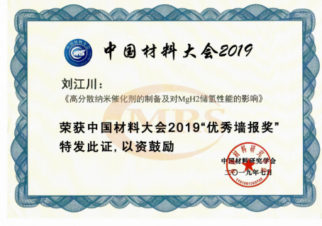 会议期间,我中心师生代表向国内外同行呈现了精彩的口头报告和墙报展示,其中朱云峰教授在能源转换与存储材料分会作邀请报告(Alloying and catalyzing modification of Mg-based hydrogen storage materials),刘江川、李淑婧、高海光、夏子杰以及黄海翔硕士生作墙报展示。参会师生同与会专家学者进行了深入交流讨论,得到了同行学者的认可。会议设立了优秀墙报奖,经会议学术评审委员会审阅和讨论,在近1200个墙报中共评选出四十余个大会优秀墙报奖。中心硕士研究生刘江川(指导老师:朱云峰)展示的作品(高分散纳米催化剂的制备及对MgH2储氢性能的影响)脱颖而出,荣获大会“优秀墙报奖”。