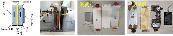 1 简易模组示意图和照片 2 测试前后气凝胶隔热片和电芯照片