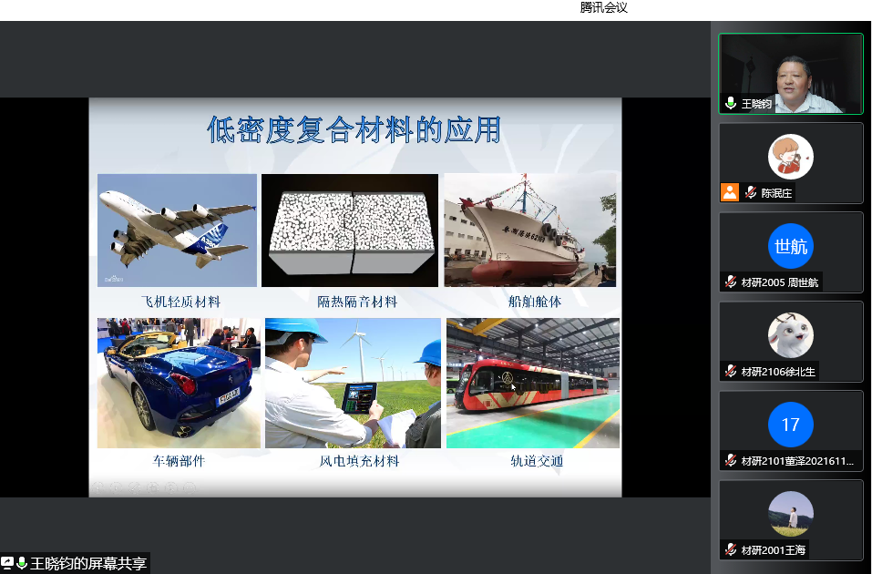 首先,王晓钧教授作了以“纤维增强低密度复合材料”为主题的报告。介绍了当今世界日新月异,我们身边的各种新材料给生产和生活带来了巨大冲击;指出树脂基复合材料全新的基础发展和在国民经济中的重要作用;提出了轻质高强复合材料的新概念、新制备和新理论,进而推动“双碳”理念和新型战略性轻质材料产业更好地发展。