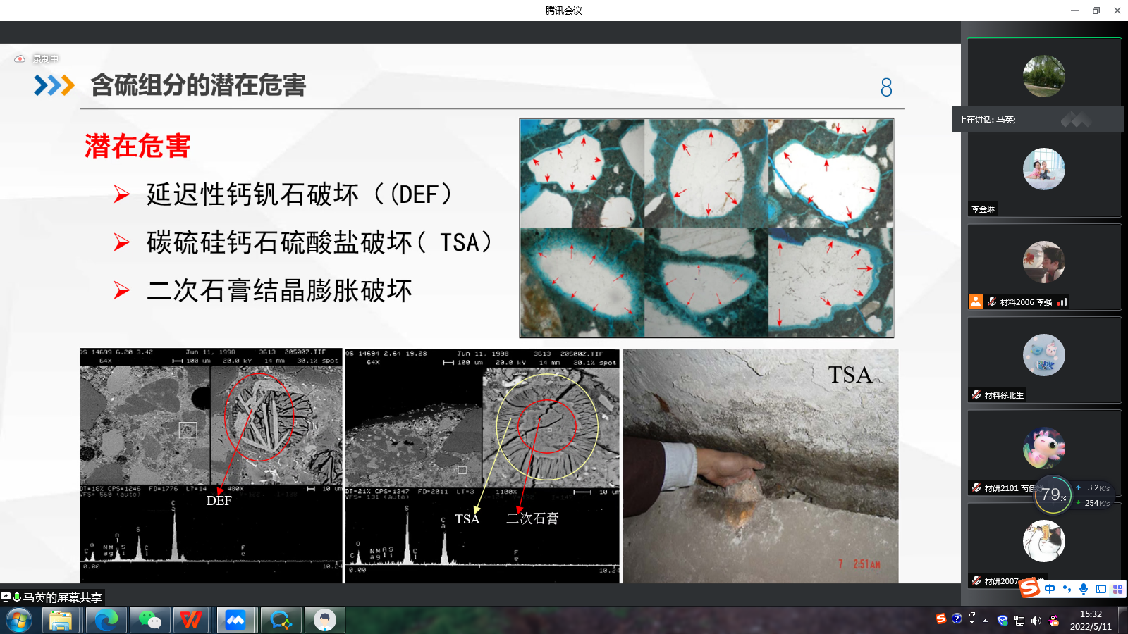 马英老师作了主题为“含硫组分和产物对水泥基材料性能影响研究”的报告,介绍了硫的来源和含硫组分分布,并分别对含硫组分对水化硬化性能影响、含石灰石质材料硫酸盐侵蚀耐久性以及新型含硫胶凝材料制备和性能等方面进行了充分严谨的分析和论述。