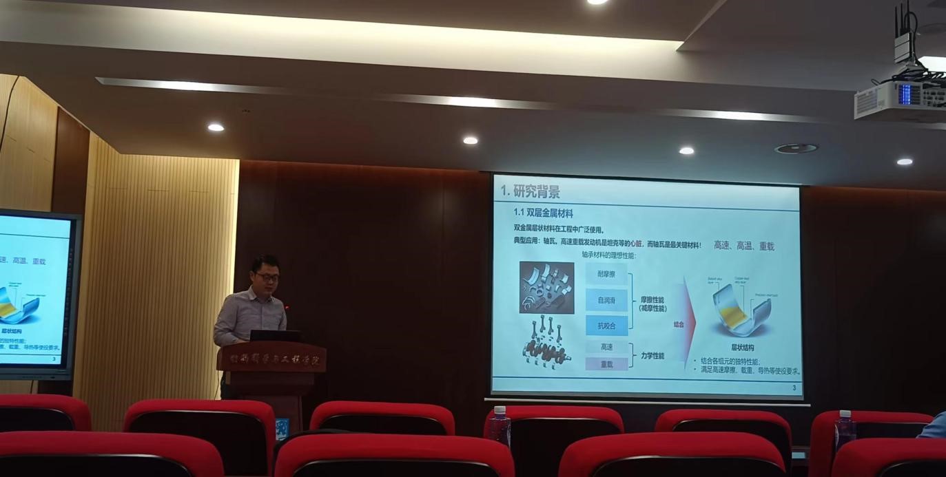 随后,李仁庚副教授作了以“连续固液复合钢/铜双金属层板变形机制”为主题的报告。在满足特定使役要求下,阐述了层状结构金属复合材料在工程上的应用;揭示了组织和残余应力对连续固液复合钢/铜双金属层复合材料力学性能及变形行为的研究。