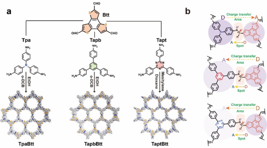 为此,best365足球官网best365足球官网吴晓栋博士联合湖南大学环境公司王侯副教授课题组、新加坡南洋理工大学赵彦利教授课题组,理论设计和合成了具有空间分离的氧化还原中心的苯并三噻吩基共价有机骨架。通过实验现象和理论模型计算验证,提出周期性共价有机网络的双供体-受体结构,即具有电荷同向转移和能差的极性连接键和供体-受体功能基元的“原子点-分子区”双结构。该特异性结构能有效调控光激发电荷在骨架内转移,抑制载流子的复合,在固-液界面反应活性位点集中于亚胺键附近的电子受体周围区域,该区域还能调节毗邻碳原子的电荷分布,优化中间体结合强度。该研究团队所提出的COF材料在水、空气和无牺牲剂条件下双氧水产率高达1407 μmol g-1 h-1,为实现更高性能的双氧水生产技术提供拱了全新的思路和途径,有望在近期取得重大突破。湖南大学钦陈程博士生、best365足球官网吴晓栋博士和湖南大学汤琳教授为共同第一作者,湖南大学王侯副教授、袁兴中教授和新加坡南洋理工大学赵彦利教授为论文通讯作者,湖南大学为论文第一单位,best365足球官网为论文第二单位。