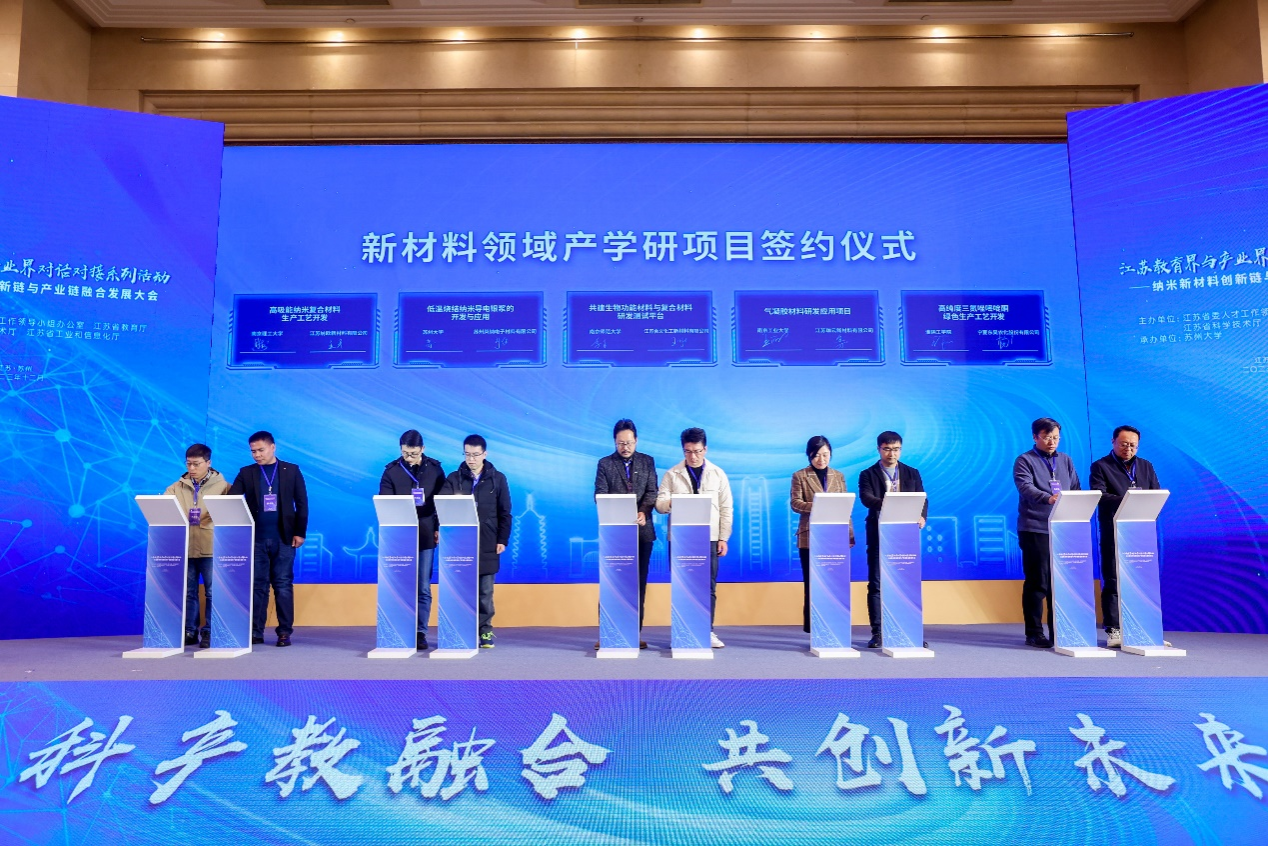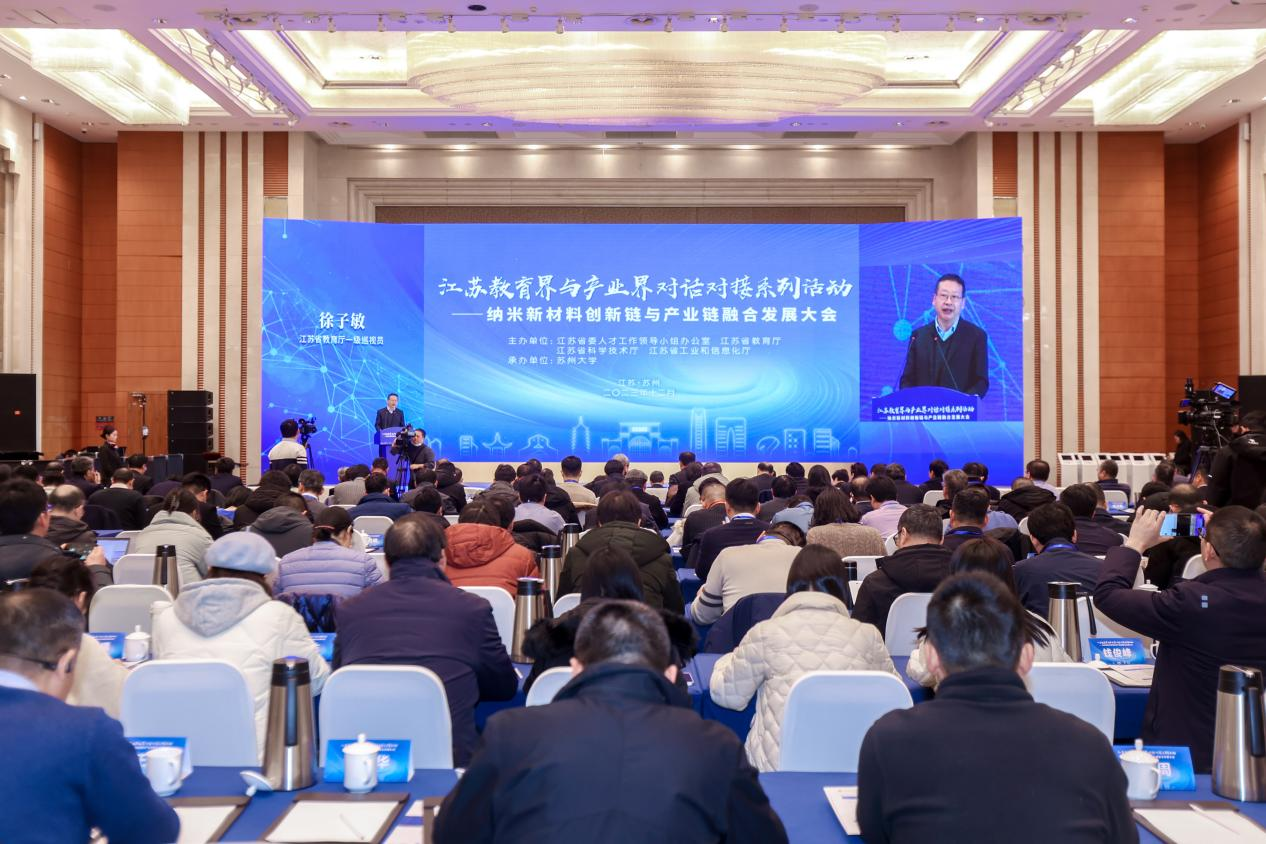 12月23日,江苏教育界与产业界对话对接系列活动——纳米新材料创新链与产业链融合发展大会在苏州召开。省教育厅厅长江涌,苏州大学党委书记张晓宏,副市长季晶,省内各高校协同创新中心牵头建设高校负责人、各协同创新中心负责人及主要协同单位代表,产业界、金融界代表等300余人参加会议。公司副董事长郭凯,自然科学处副处长王宇翔,江苏先进无机功能复合材料协同创新中心沈晓冬教授等相关负责人参加了此次会议。