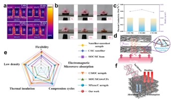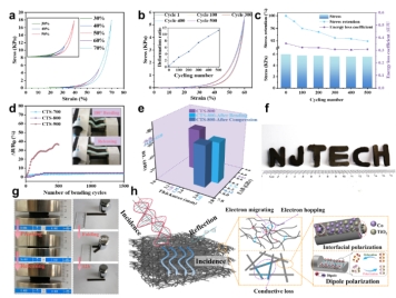 该论文中采用简单可控的混合溶液静电纺丝结合高温热处理工艺成功制备了Co和TiO2修饰的SiOC复合(CTS)纳米纤维。由于静电纺丝提供的优异的三维连续网络结构和复合相在纤维内的均匀分布,CTS复合纳米纤维表现出出色的隔热性(导热系数小于0.0404 Wm-1K-1)、优异的柔韧性(经过1500次的180°弯曲循环后电阻变化小于4%)和压缩回弹性(在应变为60%条件下经过500次压缩循环后残余应变小于12%)。在2~18 GHz波段内,纤维吸波相含量仅为5wt%的CTS-800样品可实现8.64GHz(9.36~18.00GHz)的有效吸收带宽以及-66.00dB的最低反射率(RLmin)。这种多功能CTS纳米纤维材料的成功制备,为热&电磁兼容防护材料的开发提供了广阔的前景。