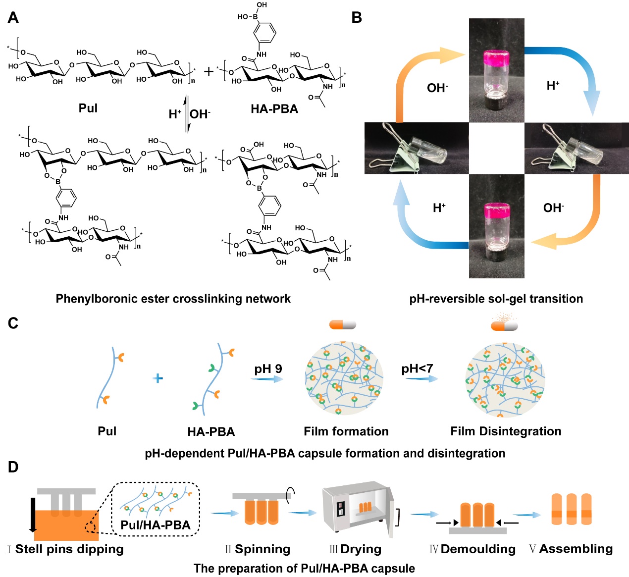 针对这一领域,best365足球官网何一燕教授、周廉院士与江苏力凡胶囊有限公司刘培勇高级工程师展开合作研究,成功开发了一种基于普鲁兰多糖(Pullulan)和苯硼酸功能化透明质酸(HA-PBA)的新型水溶性薄膜,用于制备快速崩解硬胶囊。该体系创新性地利用苯硼酸酯交联网络实现可逆的溶胶-凝胶转变,从而显著增强了胶囊在胃肠道环境中的快速崩解和溶解性能。实验结果表明,HA-PBA的引入赋予薄膜优异的综合性能,包括高透明度(>90%)、适宜的水接触角(68.2°)、良好的拉伸强度(71 MPa)和断裂伸长率(32.3%)。此外,该体系制备的胶囊在不同pH条件下均表现出优异的溶解性能,尤其在胃液环境中,其崩解时间显著短于传统的明胶胶囊和普鲁兰胶囊,能够实现药物的快速释放。本研究通过将苯硼酸功能化透明质酸(HA-PBA)作为胶凝剂,成功开发了具有快速崩解性能的普鲁兰-透明质酸水溶性薄膜和硬胶囊。该研究成果为制药行业提供了新型药物递送系统,在需要快速药物释放的场合具有广阔的应用前景。