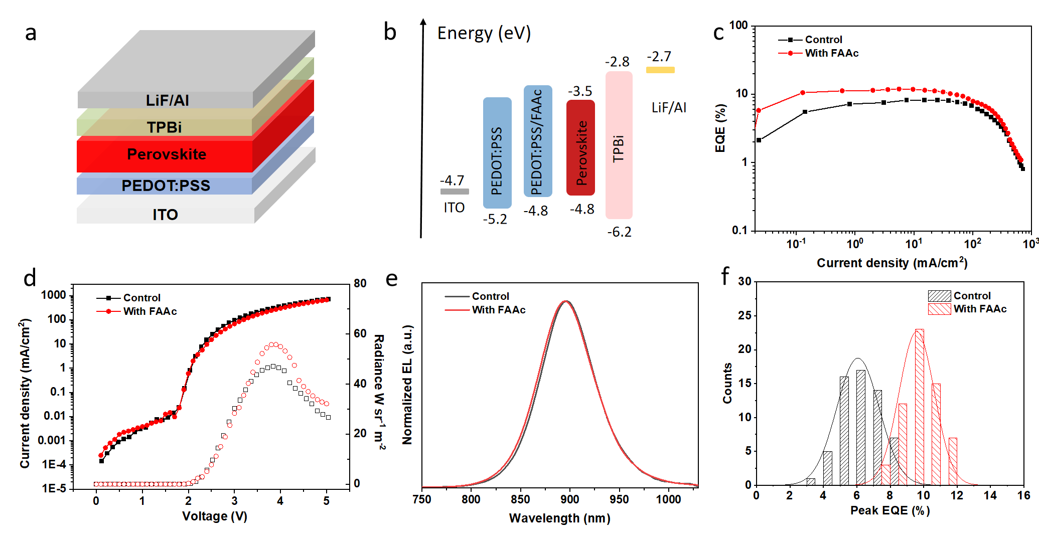 Figure 4.(a, b) Schematic illustration of the device architecture (a) and energy-level diagram (b). (c-f) EQE-Jcurve (c),J-V-Rcurve (d), EL spectra (e) and histograms of maximum EQE (f) based on FA0.9Cs0.1SnI3perovskite films without and with FAAc.