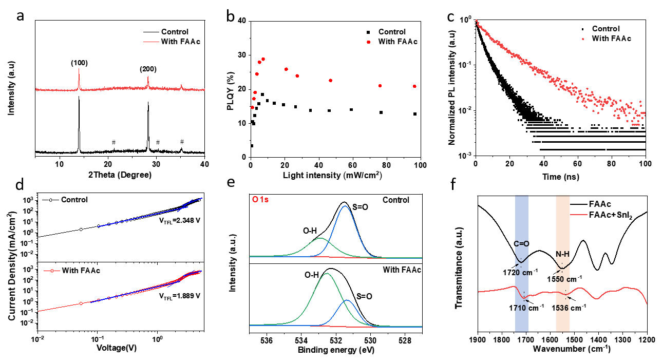 Figure 3.(a) XRD patterns, #indicates the diffraction data from the ITO substrate, (b) PLQYs, and (c) TRPL of perovskite films fabricated without and with FAAc. (d)J-Vcurves of the holy-only devices without and with FAAc modification. (e) O 1s XPS spectra of PEDOT:PSS on silicon substrate, without and with FAAc modification, and the FAAc-modified samples was washed out by DMSO. (f)FTIR spectra of FAAc and the complex of FAAc and SnI2.