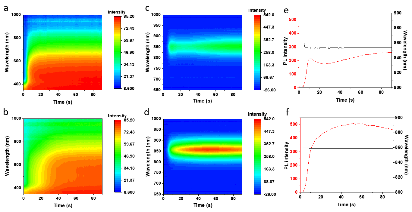 Figure 2.(a, b) In-situ UV-vis measurements of Sn-based perovskites without (a) and with FAAc (b) during the annealing process. (c-f) In-situ PL measurements of Sn-based perovskites without (c, e) and with FAAc (d, f) during the annealing process.