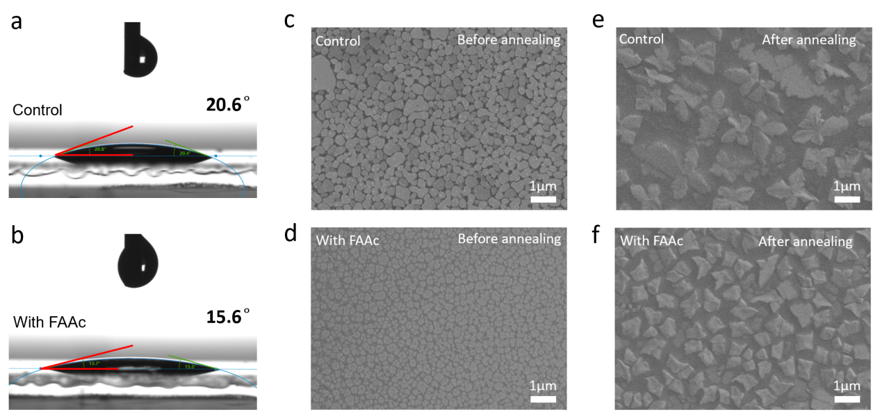 Figure 1.(a, b) The contact angle of perovskite precursor solution without (a) and with FAAc (b) on PEDOT:PSS substrate. (c-f) SEM images of FA0.9Cs0.1SnI3perovskite films without and with FAAc before (c, d) and after annealing (e, f), respectively.